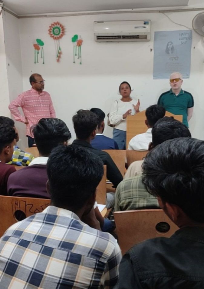 | Definition | Our founder, Nimay Gupta gave a talk at a Vision India centre for training youth from rural backgrounds in electronics under the Deen Dayal Upadhyaya Grameen Kaushalya Yojana. Along with motivating the youth to accept their backgrounds and make the most of the resources available to them, he also raised awareness about albinism, talking about the challenges that come with it and how the young people could be a friend to someone with albinism or low vision. The themes of empowerment, lifting one another up, and breaking barriers were emphasised in the talk, which will help all of us, including those with albinism grow together and beat challenges head on. |